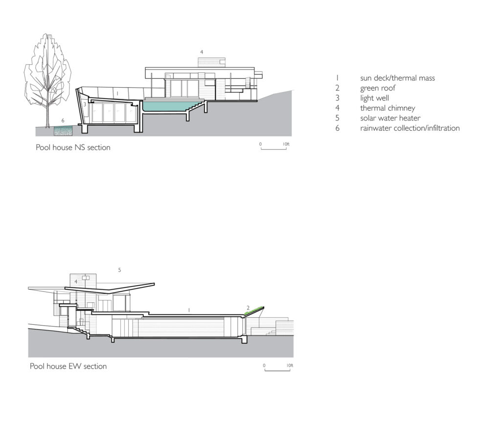 At the far end, a light shaft penetrates from sundeck above, and a concrete canopy rises to mark the linkage to the guest house and reconnection to the landscape above.